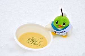 歩き始めて1時間ちょっとたったところで、お昼ご飯を食べたよ。お弁当を持って行ってたんだけど、ガイドの方がね、コーンスープをくれたんだ~。温かいものを口にするとホッとするよね。とってもおいしかった♪これ、雪の上だよ。