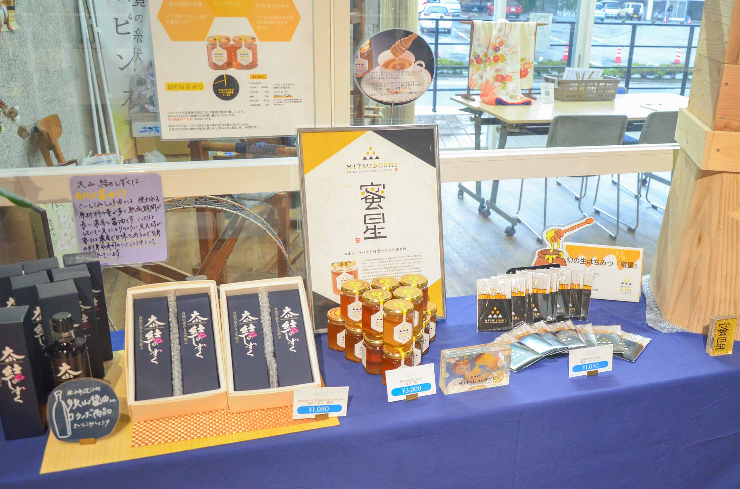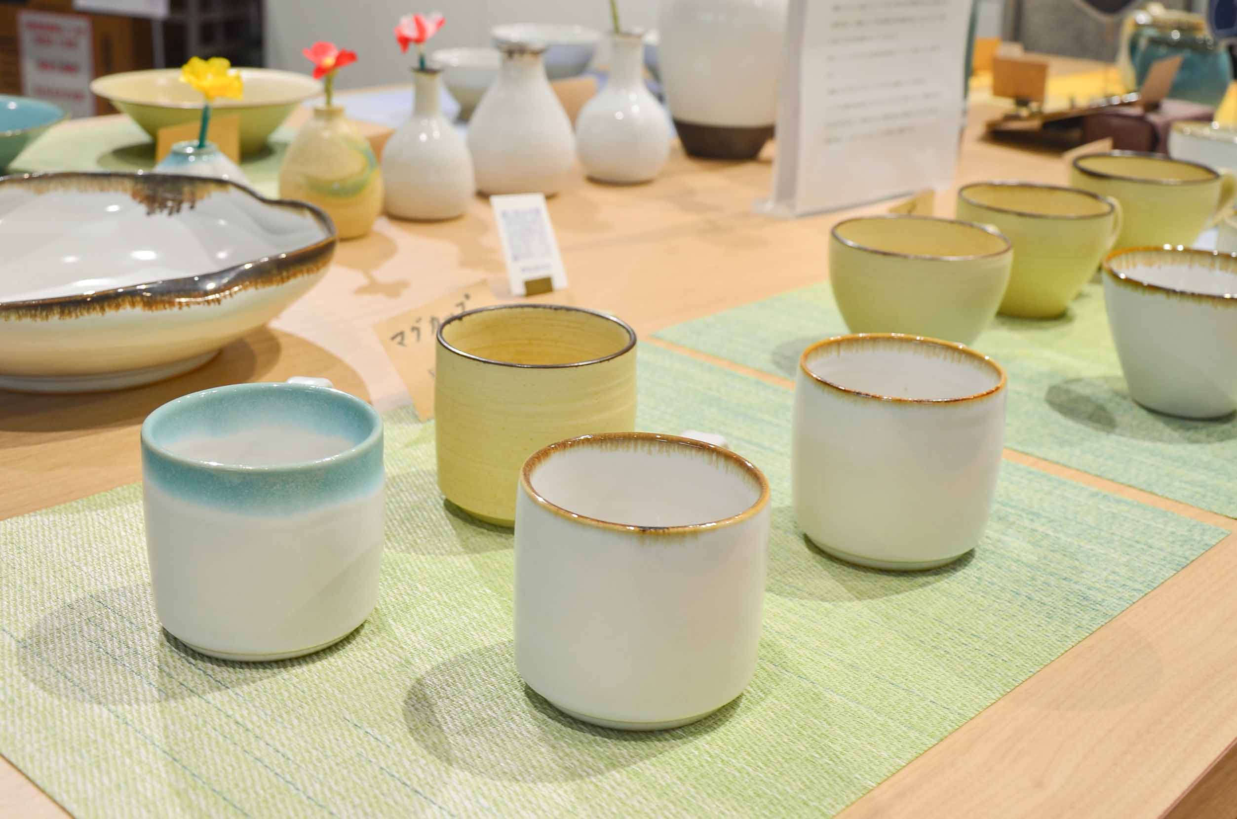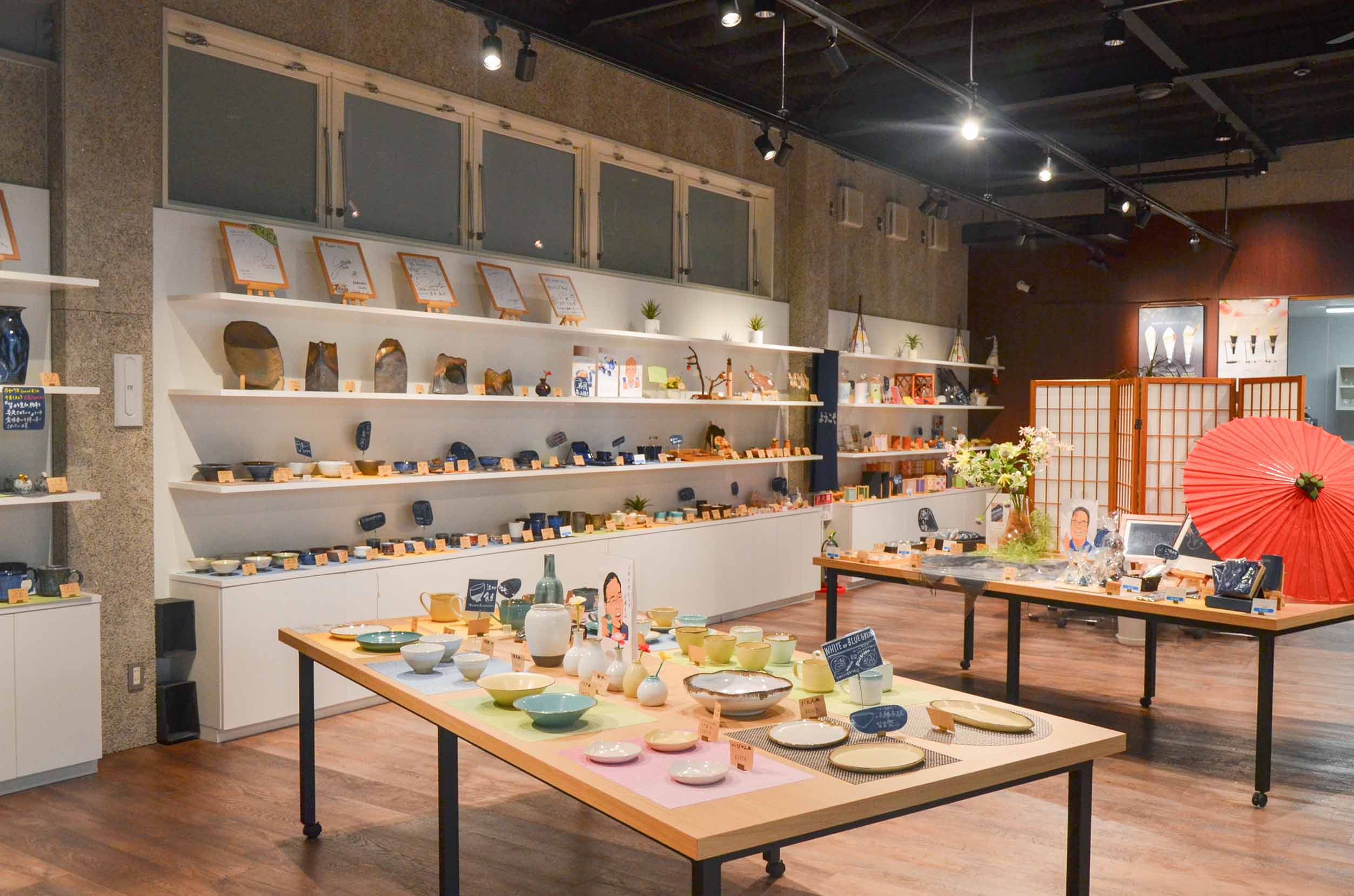 お皿やカップ、弓浜絣の小物など、山陰各地から取り寄せた工芸品が数多く並びます。旅の思い出に、物として残るお土産選びもオススメです。