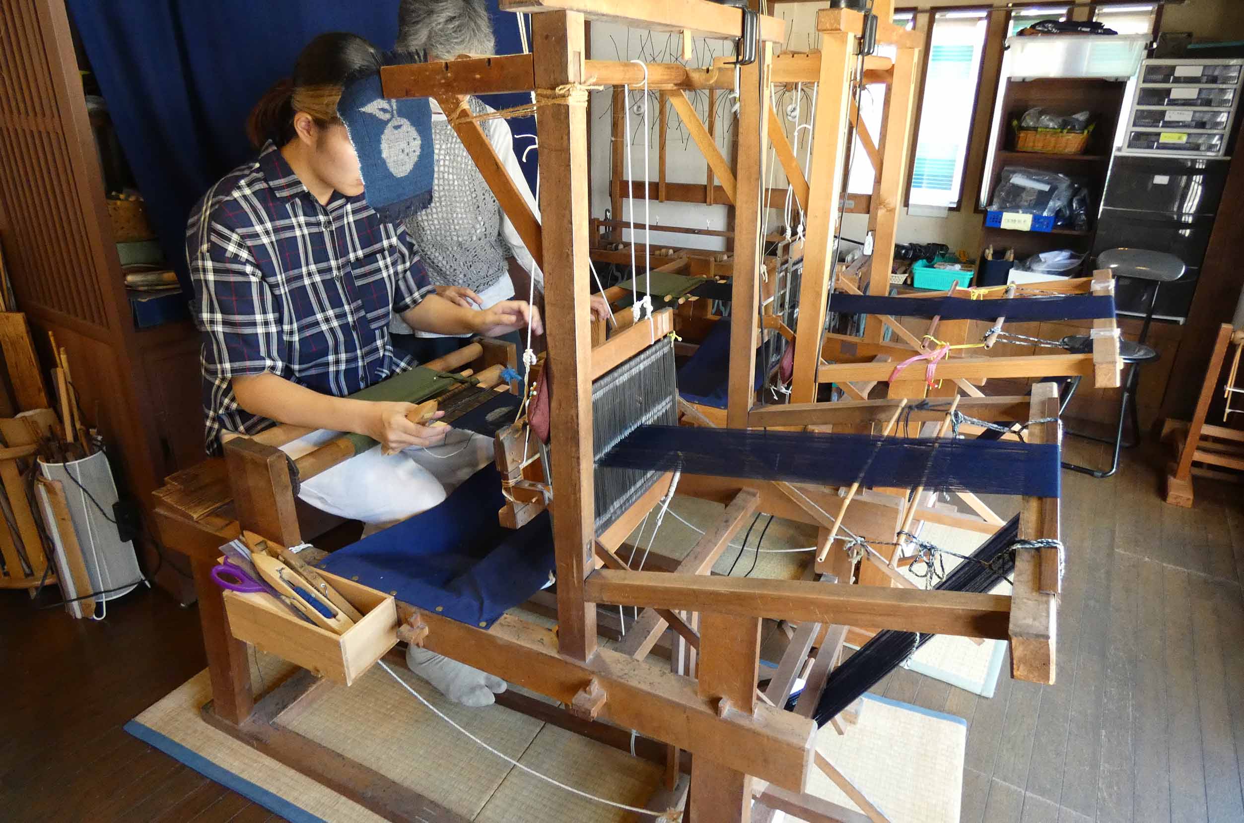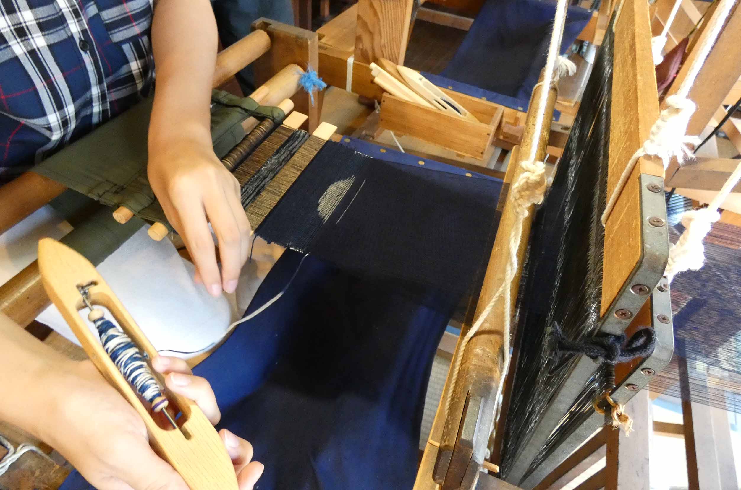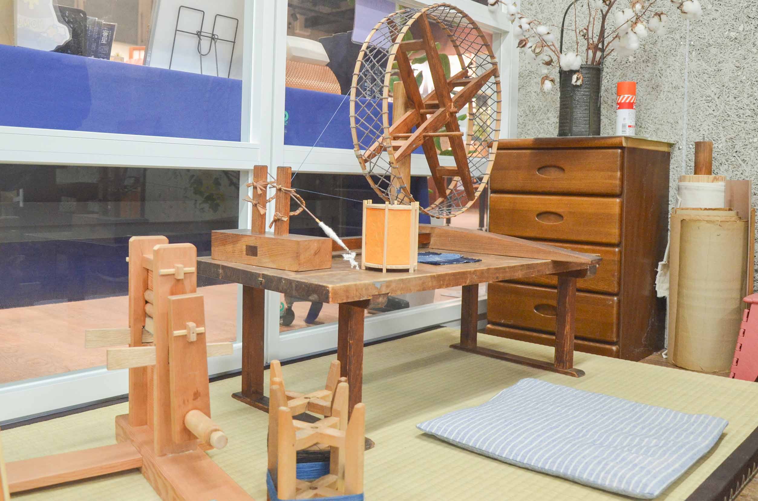弓浜絣は、弓ヶ浜半島で江戸時代から伝わる木綿の織物です。ここでは、昔ながらの機織り機で、コースター作り体験ができます。スタッフの方が丁寧に教えてくださるので、機織り初心者でも安心。藍染めの紺のグラデーションと綿糸の白のコントラストが特徴です。また、綿から糸、布になるまでに使用する昔ながらの道具も展示されています。