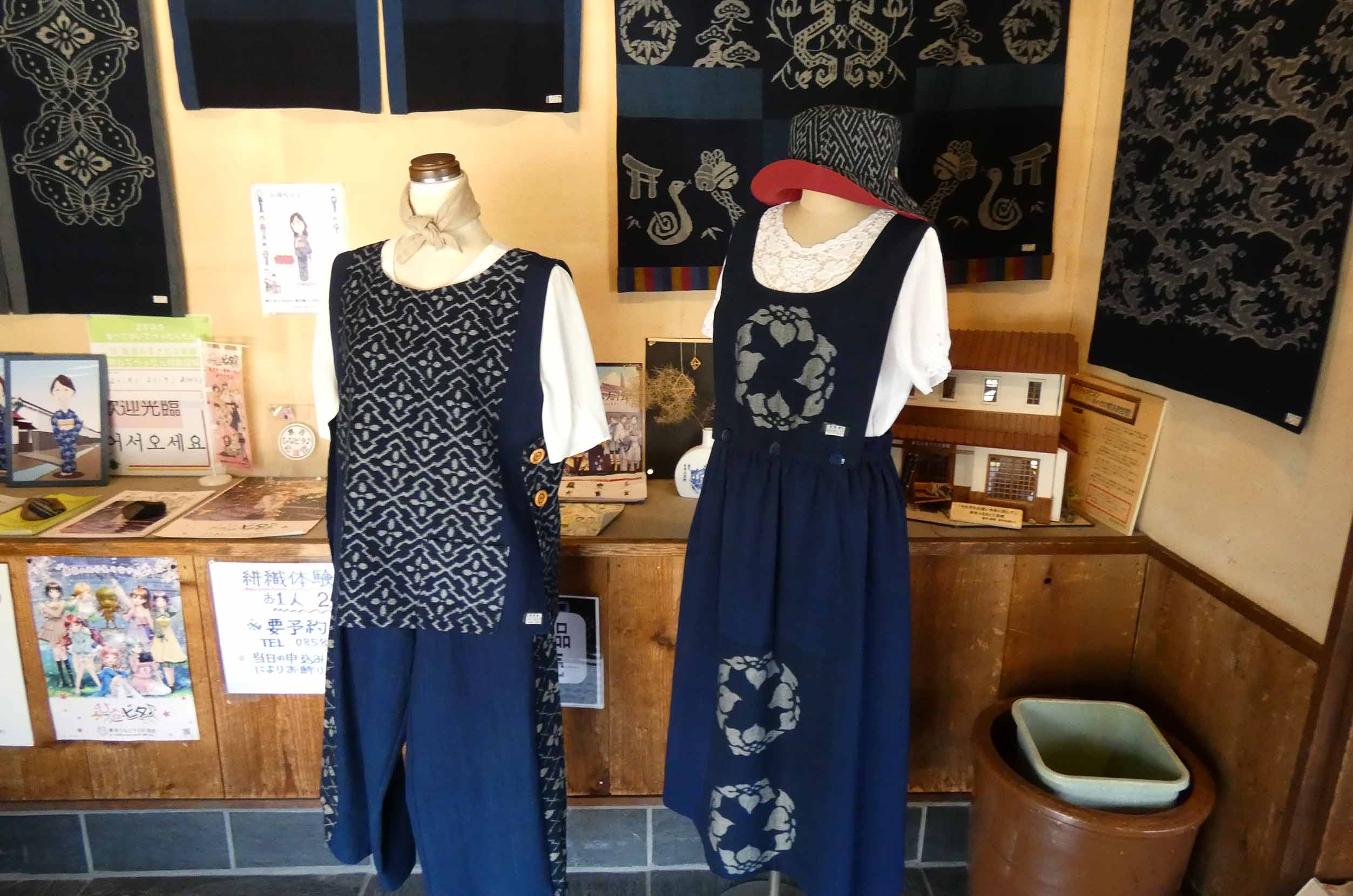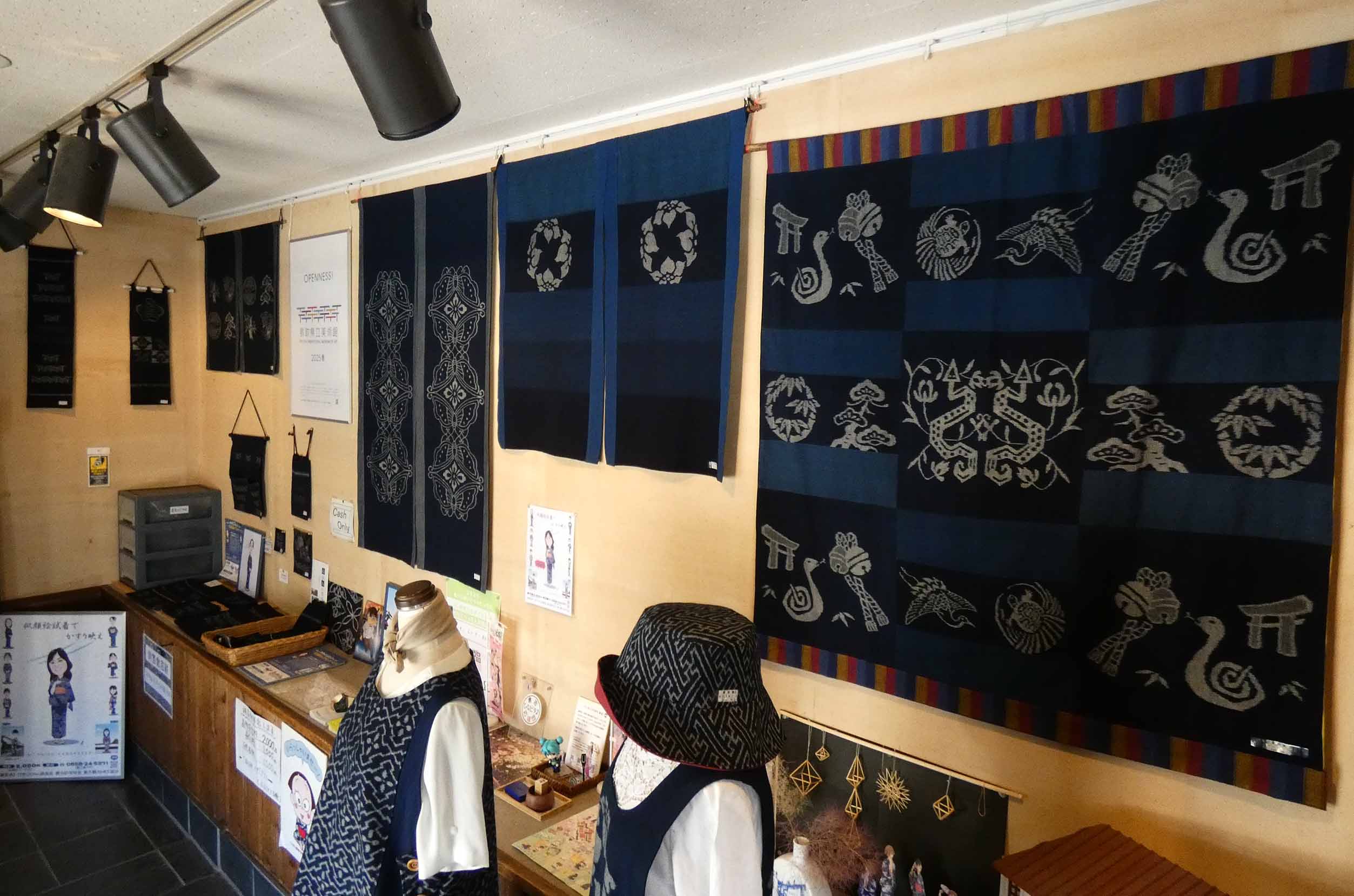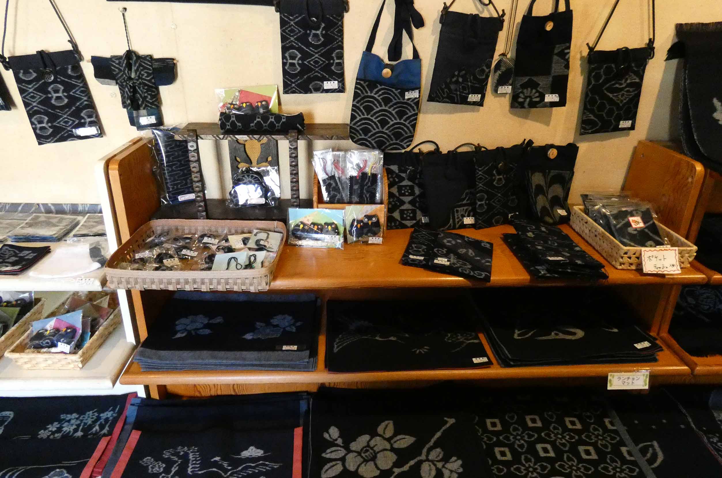 のれんや、かばん、小物など、多数の倉吉絣の商品が並びます。鶴や亀、松などの縁起のよい吉祥文様も多く、全体に柄の入ったものや、ポイントで入っているものなど、どれも素敵な作品ばかり。お気に入りのひとつを見つけてください。