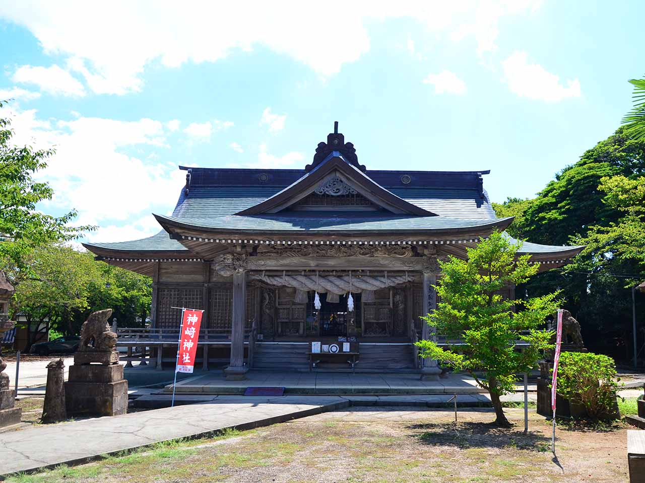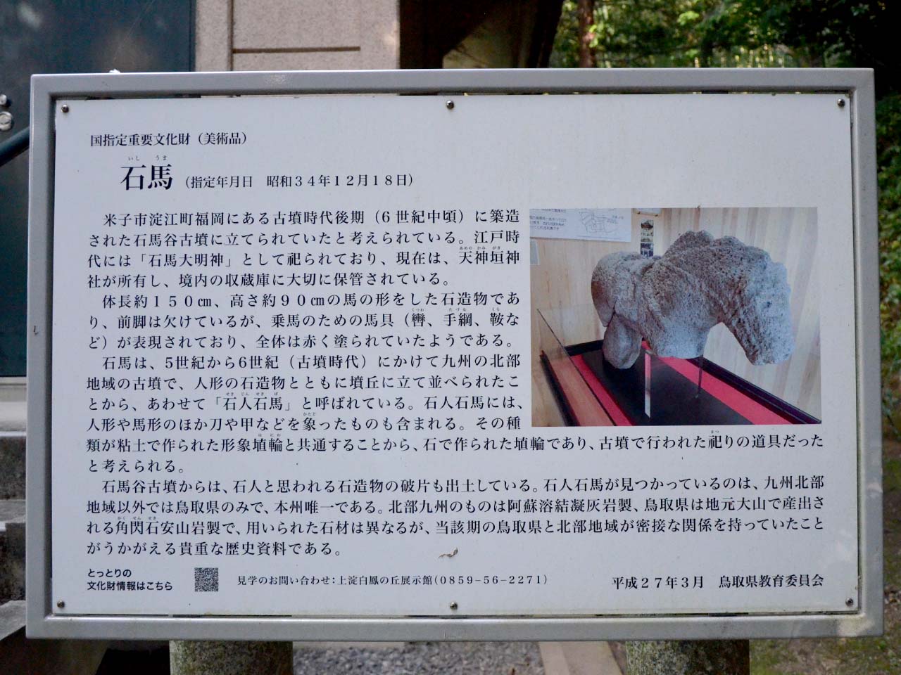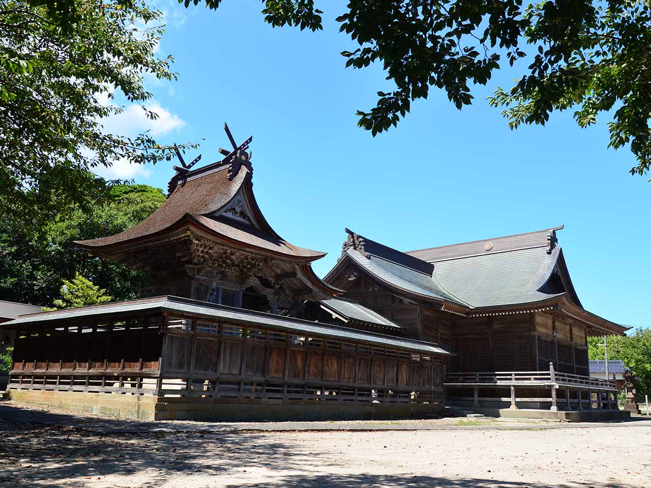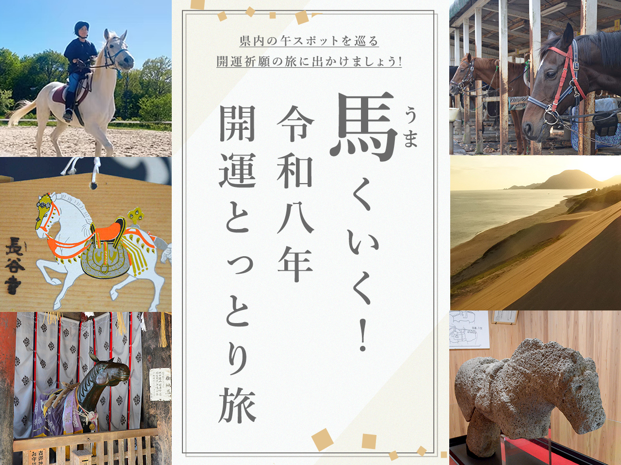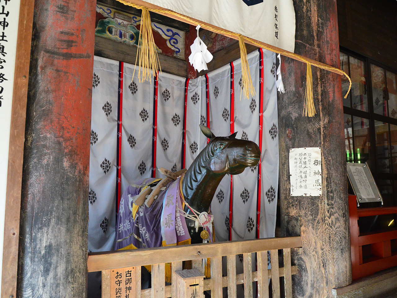 妻木晩田遺跡(むきばんだいせき)や向山古墳群(むこうやまこふんぐん)に近く、少彦名命(すくなひこのみこと)ほか四柱を祭神として祀っています。境内には、本州で一体しか見つかっていない「石馬」があり、昔から石馬大明神として大切に保存されてきました。(現在は収蔵庫に保管されています) 9月第一日曜日に行われる「八朔祭り」では、稲ワラで巨大な大蛇を作り、氏子全員で綱引きをして収穫を感謝します。天駆ける天馬のように、運勢が上昇するよう願いましょう。