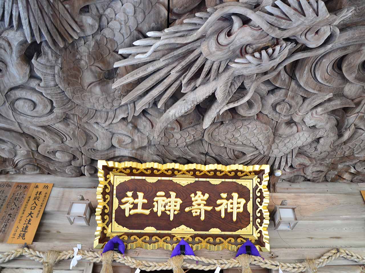 社殿の周囲一面に施された彫刻は圧巻で、ことに拝殿向拝の天井に彫られた龍は、豪快な刀法で迫力があります。龍が持つ玉の下に立つと御利益があると言われています。