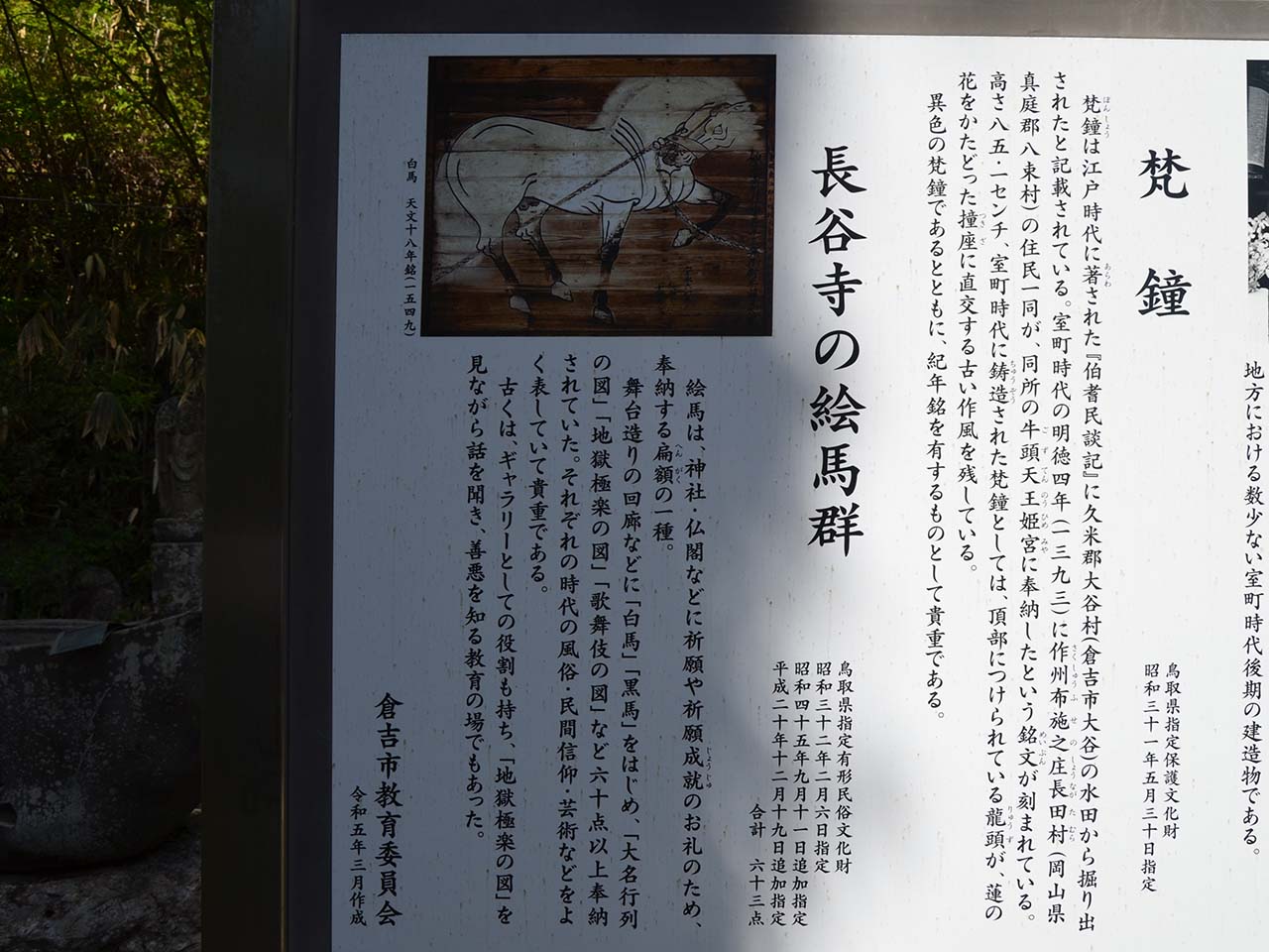 昭和32年(1957年)2月に県の保護文化財に指定された奉納絵馬が多く所蔵されており、平安時代の絵師巨勢金岡が描いたという伝承もある「天文18年繋白馬図(つなぎはくばず)」は、夜な夜な絵から抜け出し、暴れまわったという伝説があります。(絵馬堂見学は要事前連絡)