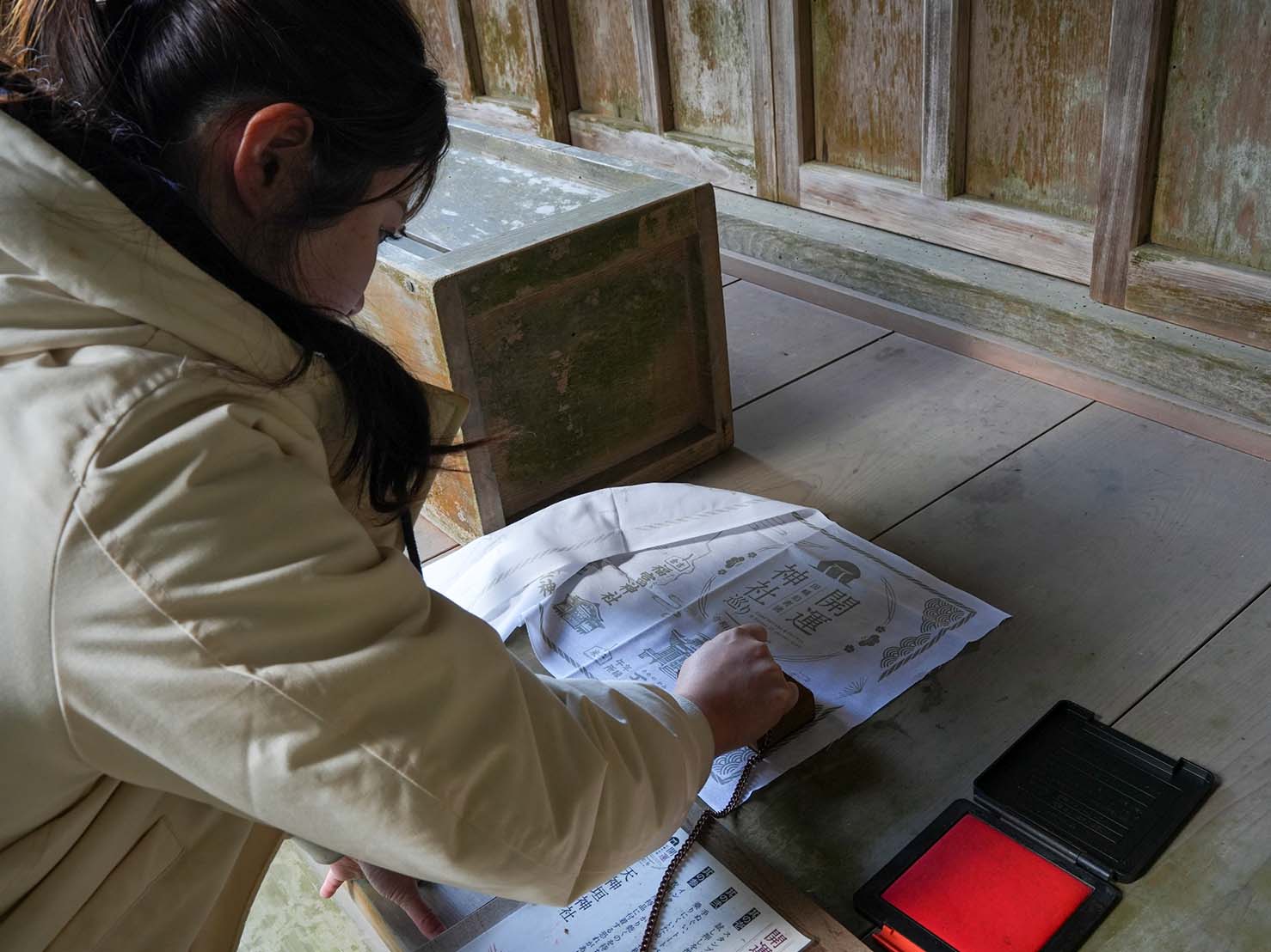 開運神社巡り用のスタンプは、拝殿の賽銭箱右横に設置されています。神社を巡って自分だけのオリジナル開運グッズが出来上がっていくのにワクワク♪
